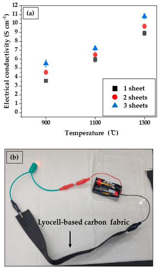 Figure 2a displays the electrical conductivity of lyocell-based carbon fabrics according to various carbonization temperatures and the number of stacked carbon fabric sheets. With an increase in the carbonization temperature and the number of stacked carbon fabric sheets, the electrical conductivity increased. For example, for a sing sheet of a lyocell-based carbon fabric obtained by carbonization at 900, 1100, and 1300 °C, the electrical conductivity obtained were 3.57 ± 0.15, 5.96 ± 0.31, and 8.91 ± 0.24 S m−1, respectively. This is due to the growth of the crystallographic order of carbon fabrics in line with the carbonization temperature that facilitated electron transport [39,40,41]. Finally, when three sheets of lyocell-based carbon fabrics obtained at 1300 °C were stacked, the highest electrical conductivity, 10.80 ± 0.30 S m−1, was obtained. These high electrical conductivities were om accordance with the EMI SE effects. Additional evidence of the high electrical conductivity of the lyocell-based carbon fabrics is shown in Figure 2b, which illustrates a lyocell-based carbon fabric lighting up an electric bulb in a closed loop.