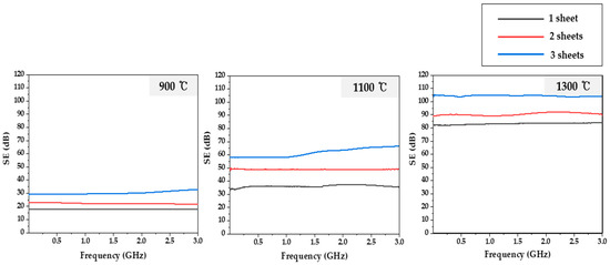 Figure 4 exhibits the results of EMI SE of lyocell-based carbon fabrics according to various carbonization temperatures and numbers of stacked carbon fabric sheets. Typically, EM shielding materials have high electrical conductivity. As shown in Figure 4, EMI SE increased as carbonization temperature increased due to the increased electrical conductivity. In the case where the total EMI SE was over 60 dB, EM radiation was reduced by 99.9999% [44]. In the case of three sheets of lyocell-based carbon fabric carbonized at 1100 °C, the EMI SE was over 60 dB in the range of 1.5–3.0 GHz. In the case of all samples carbonized at 1300 °C, the EMI SE exceeded 80 dB in all measured ranges. Notably, in the case of three sheets of lyocell-based carbon fabric carbonized at 1300 °C, the EMI SE was the highest at approximately 105 dB. Compared to other previous studies, Yim et al. [25] reported on the EMI SE of electroless FeCoNi-plated carbon fibers. Although three different kinds of metals were plated on the carbon fiber, per the results, an EMI SE of 69.4 dB at 1.5 GHz was observed for 60-FeCoNi-plated carbon fibers treated for 60 min in the plating solution. Additionally, Li et al. [45] fabricated carbon fabric-NiCo composites, and it was observed that a carbon fabric-NiCo2O4 composite, having a thickness of 0.34 mm, resulted in an EMI SE of 53 dB. Further, Thi et al. [46] researched flexible MOF on CoXFe1−XOOH@carbon films for sufficient EMI shielding, and it was observed that the EMI SE of CoFe/CoCu-carbon films (MOF growing for 45 min) was 73.46 dB. Lastly, Park et al. [19] investigated the EMI SE of carbon papers obtained from blending tall goldenrod celluloses and carbon nanotubes (CNTs), and it was reported that cellulose carbon paper containing 15 wt% CNTs with a thickness of 4.5 mm, carbonized at 1300 °C, showed an EMI SE of 62 dB at 1.6 GHz. Therefore, in the case of the lyocell-based carbon fabrics carbonized at 1300 °C, an excellent EMI SE exceeding 80 dB was observed without plating or adding any metals or carbonaceous fillers.