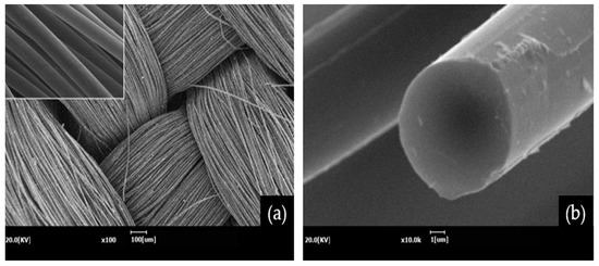 Figure 5 shows surface and cross-sectional images of the lyocell-based carbon fabric carbonized at 1300 °C. As shown in Figure 5a, the twill shape of the fabric is uniformly maintained without cracks or porosities even after carbonization temperature at 1300 °C. In Figure 5b, carbon fibers plucked from the carbon fabric appear to have smooth surfaces and clearly circular cross-sections. Figure 6 displays the estimated tensile strengths of fibers plucked from the lyocell-based carbon fabric carbonized at various temperatures. The tensile strengths of the carbon fibers for all carbonization temperatures were over 1.3 GPa, with a slight increase observed in carbon fibers with a higher carbonization temperature owing to the expansion of the ordered graphitic region.