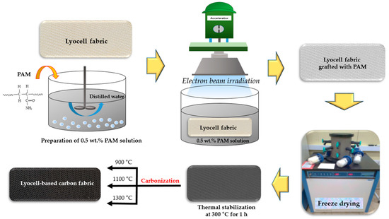 In order to obtain lyocell-based carbon fabrics, lyocell fabrics (measuring 10 × 5 cm2) were immersed in 0.5 wt. % PAM solution and irradiated with a 100 kGy. EBI management was performed using a conveyor-style scanned beam at an accelerating voltage of 1.14 MeV, a beam current of 7.6 mA, and a dosage rate of 6.67 kGy/s in the air at room temperature. Lyocell fabrics treated with EBI in 0.5 wt. % PAM solution were lyophilized and then thermally treated at 300 °C for 1 h. Subsequently, carbonization was conducted at 900, 1100, and 1300 °C without carbonization, keeping time in a tubular furnace with a pure nitrogen gas (99.999%) atmosphere. Figure 7 shows a schematic illustration for the carbonized lyocell fabrics according to carbonization temperature.