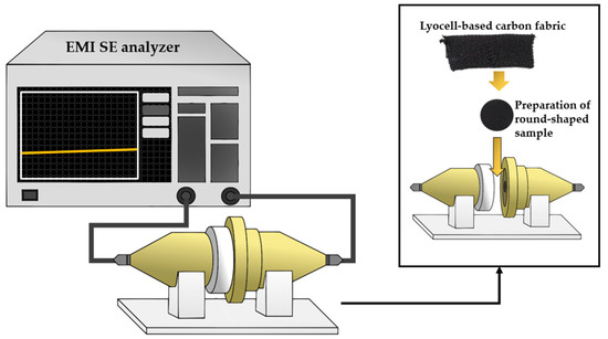 In order to estimate the crystallinity of lyocell-based carbon fabrics obtained through various carbonization temperatures, XRD profiles were recorded using D/MAX-2500 (RIGAKU, Tokyo, Japan) at 40 kV and 30 mA with CuKα radiation. Raman spectra were accomplished on an ARAMIS instrument (Horiba Jobin Yvon, Tokyo, Japan) with a 514 nm laser in the range from 500 to 3500 cm−1. The electrical conductivity was obtained by measuring the surface and volume resistivities of samples using MCP-1700 LOTESTA-GX (NITTOSEIKO ANALYTECH, Kanagawa, Japan). The EMI SE was analyzed using E5071C ENA Vector Network Analyzer (Keysight, Santan Rosa, CA, USA) in the frequency range from 0.5 to 1.6 GHz. Figure 8 illustrates the EMI shielding analyzer. The tensile strengths of lyocell-based carbon fabrics for various carbonization temperatures were measured using an Automatic Single-Fiber Tester Favigraph (Textechno, Mönchengladbach, Germany) equipped with a load cell of 100 cN after plucking a single fiber from the carbon fabric.