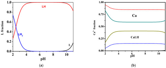 As can be observed in the distribution diagram in Figure 2a, at t = 25 °C and I = 0.15 mol L−1, the mono-protonated species is formed in all pH ranges, reaching its maximum ligand fraction, corresponding to over 0.9, in the range 4 ≤ pH ≤ 10. Differently, the fractions of the di-protonated and deprotonated species became significant at very acid pH (pH = 2) and alkaline pH values (pH = 11), respectively.