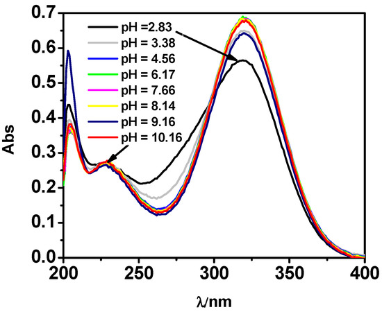 As widely reported in the literature, the high ability of L to absorb in the UV range has often been used to determine quantitatively and qualitatively this antibiotic in waters [18,42,43]. Various spectrophotometric titrations on solutions containing L and M-L mixtures were performed to investigate L spectral behavior and to confirm the protonation and formation constants values as well as the speciation model obtained by potentiometry, as already shown with other systems [44,45]. The analysis of the UV data, by using the HypSpec program, showed a very good agreement with potentiometric results, highlighted by the similarity of both the values of the protonation constants, as reported in Table 2. The formation constant value of MLH species was also confirmed by UV results. Figure 3 shows, by way of example, some of the spectra acquired on solutions containing L at selected pH in the spectral range 200 ≤ λ ≤ 400 nm. Spectra referring to M-L solutions in the same spectral and pH range show a very similar behavior, as reported in Supplementary Material.