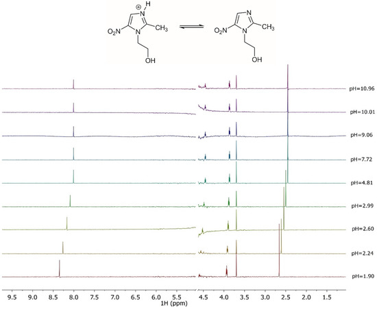 1H NMR spectra on solutions containing MNZ (L) at CL = 5 mmol L−1, t = 25 °C, I = 0.15 mol L−1 in NaCl, 1.90 ≤ pH ≤ 10.96.