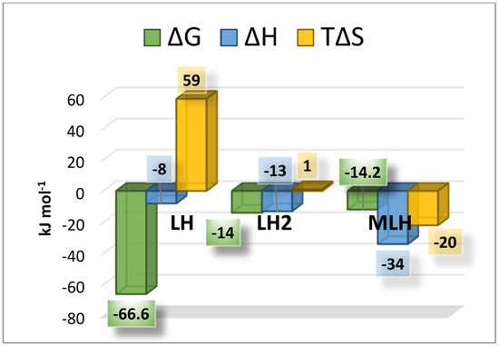 Bar plot of the thermodynamic parameters referred to LH, LH2 and MLH species at t = 25 °C and I = 0.15 mol L−1 in NaCl.