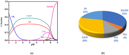 Diagrams of MNZ (L) species under sea water conditions (CL = 8·10−10 mol L−1, CCa = 0.01 mol L−1, CMg = 0.043 mol L−1, CCu = 4·10−5 mol L−1, CZn = 1.5·10−9 mol L−1, I = 0.7 mol L−1, t = 25 °C): (a) Speciation diagram; (b) Pie chart at pH = 8.1.