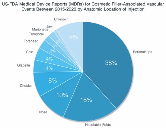 - Ortiz, A.E.; Ahluwalia, J.; Song, S.S.; Avram, M.M. Analysis of U.S. food and drug administration data on soft-tissue filler complications. Dermatol. Surg. 2020, 46, 958–961. [Google Scholar] [CrossRef]