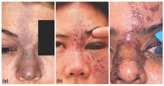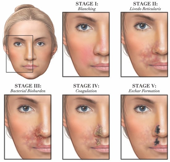 - Soares, D.J.; Bowhay, A.; Blevins, L.W.; Patel, S.M.; Zuliani, G.F. Patterns of filler-induced facial skin necrosis: A systematic review of 243 cases and introduction of the F.O.E.M. scoring system and grading scale. Plast. Reconstr. Surg. 2022, in press.