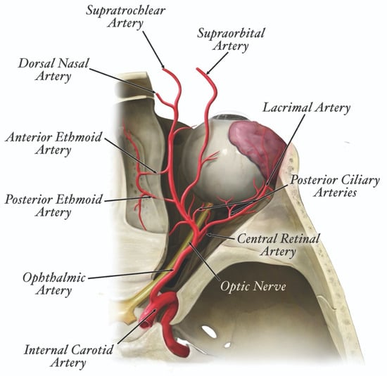 - Bertelli, E.; Regoli, M.; Bracco, S. An update on the variations of the orbital blood supply and hemodynamic. Surg. Radiol. Anat. 2017, 39, 485–496. [Google Scholar] [CrossRef]