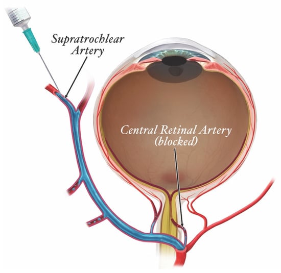 - Hakim, N.; Hakim, J. Intra-arterial thrombolysis for central retinal artery occlusion. Clin. Ophthalmol. 2019, 13, 2489–2509. [Google Scholar] [CrossRef] [PubMed]
