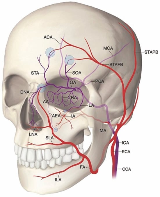 - Li, Z.-H.; Alfertshofer, M.; Hong, W.-J.; Li, X.-R.; Zhang, Y.-L.; Moellhoff, N.; Frank, K.; Luo, S.-K.; Cotofana, S. Upper facial anastomoses between the external and internal carotid vascular territories–A 3d computed tomographic investigation. Aesthet. Surg. J. 2022. [Google Scholar] [CrossRef]