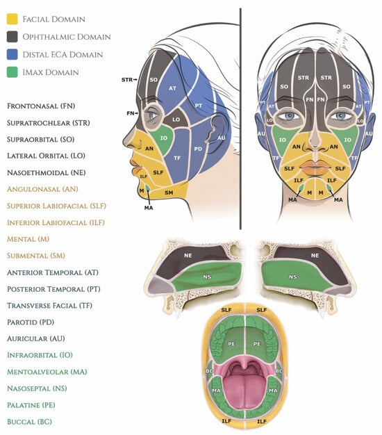 - Whetzel, T.; Mathes, S.J. Arterial anatomy of the face: An analysis of vascular territories and perforating cutaneous vessels. Plast. Reconstr. Surg. 1992, 89, 591–603. [Google Scholar] [CrossRef] [PubMed]