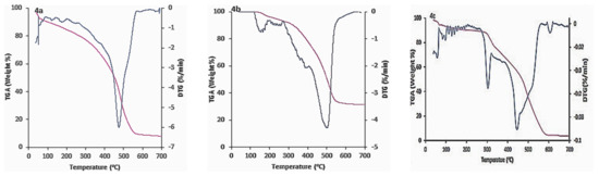 Thermal gravimetric analysis (TGA) and thermoanalytical curves were detected using a Perkin-Elmer TGA7 Thermobalance (Waltham, MA, USA). The selected operating conditions were: temperature heating range was 20–700 °C, the heating rate was 10 °C min−1, and the flow rate was 20 mL min−1 in pure nitrogen atmosphere.