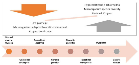 Changes in gastric microbiota and microenvironment during carcinogenesis (adapted from [11,13,16]). Following infection, H. pylori dominates the gastric microbiota leading to chronic gastritis, reduced acid secretion, and alterations in the gastric microbiome.