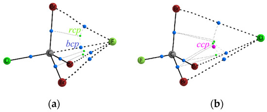 For complexes in which Tt = C, it has been found that the bcp (3, −1) is formed only for the F−…C bonds. In other cases, we observe the arrangement of electron density curvature according to the cage type, with a cage critical point (ccp) (3, +3) approximately on the line Hal−…C, Hal = Cl−, Br−. In this case, any halide anion forms the bond paths with any substituent X = Cl, Br, CH3. It is interesting that in two isoelectronic complexes F–CCl3…Cl− and Cl–CCl3…F−, the formation of completely different electron density curvature between the Hal– and C atoms is observed (Figure 1). This observation confirms that the fluorine atom is not the best polarizing carbon substituent, but it is able to form the noncovalent bond F−…C with relatively high values of ρ(rbcp). The values of electron density at the cage critical points, ρ(rccp), are almost an order of magnitude lower than ρ(rbcp) in complexes with a typical TtB.