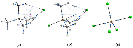 For most complexes Y–TtX3…Hal–, Tt = Sn, Pb, we observe a relatively strong formation of Hal−…Tt bonds formation (Figure 3b,d) accompanied by bcp with rather high values of ρ(rbcp). The geometry of the complexes takes the form of a trigonal bipyramid, as a rule. Nevertheless, in the series of Tt = Sn complexes, there are still cases where the tetrahedral form of the Y–Sn(CH3)3 molecules is retained, where the electron-donor groups NH2 and CH3 participate as Y substituent (Figure 3a,c). It can be concluded that the effect created by the polarizing group Y is important, and its manifestation is clearly visible in the series from Si to Sn. For Tt = Pb, all complexes are trigonal bipyramids and they are characterized by a low negative binding energy, Ebind, and ρ(rbcp) between Hal– and Pb is equal or comparable to the values for the covalent bonds of the corresponding sort.