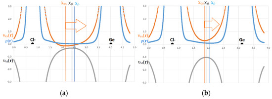 The disposition of electron density, and electrostatic potential minima and potential acting on an electron in a molecule, (a.u.) along interatomic line Hal–…Ge in complexes (a) F–Ge(CH3)3…Cl− and (b) F–GeF3… Cl−. The arrows point to the atom providing electrophilic region. Vertical lines show the extremes of functions; corresponding color is used.