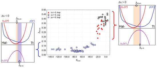 We could estimate the contribution to the electron exchange energy from Hal–…Tt bonds by the expression Vx = −δ(Hal|Tt)/2R(Hal…Tt) [75,76], where δ(Hal|Tt) is the electron delocalization indices and R(Hal…Tt) is the interatomic distance. It can be seen that each nucleophilic fragment, F–, Cl–, and Br–, is responsible for its own trend, which is not exponential (Figure 6b). For very weak interactions of any sort, Vx asymptotically tends to zero. The narrowest gap ∆st-es ~ 0.05 Å corresponds to values Vx < −0.10 a.u.