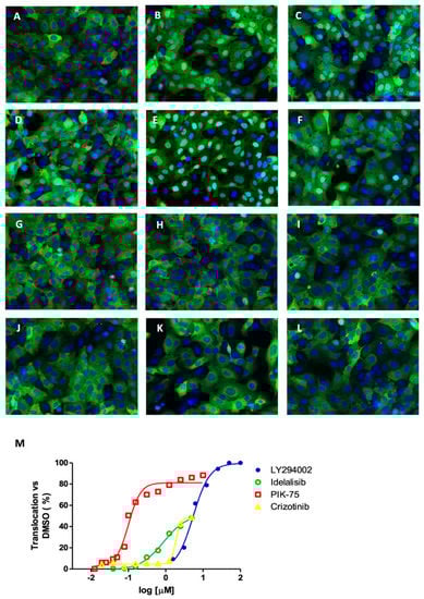 Second layer kinases effect on FOXO3 nuclear translocation. U2foxRELOC cells were treated either with (A) 0.5% DMSO, (B) 20 nM LMB, (C) 25 μM LY294002, (D) 500 nM idelalisib, (E) 500 nM PIK-75, (F) 500 nM crizotinib, (G) 500 nM lenvatinib, (H) 500 nM lapatinib, (I) 500 nM erlotinib, (J) 500 nM afatinib, (K) 500 nM trametinib, (L) 500 nM SCH772984 for 60 min. Representative images at 20× magnification are shown. (M) Dose-response representation of positive compounds tested in serial dilutions.