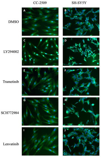 FOXO translocation in neuroblastoma cells and fibroblast. Effect on nuclear translocation of VEGFR, MEK and ERK inhibitors in CC-2509 and SH-SY5Y cells. Immunocytochemistry for FOXO3a was carried out in fibroblasts (CC-2509) and a neuroblastoma (SH-SY5Y) cell line treated for 1 h with (A,B) 0.5% DMSO, (C,D) 25 μM LY294002, (E,F) 1 μM trametinib, (G,H) 1 μM SCH772984 or (I,J) 1 μM lenvatinib. Fixed cells were incubated with green fluorescent specific antibody against FOXO3, and DAPI for nuclear staining, and imaged with fluorescence microscopy. Representative images taken at 20× magnification are shown. As it can be seen in the images taken, only LY294002 (PI3K inhibitor) causes FOXO3 nuclear translocation.