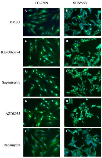 Effect of mTORC inhibitors on nuclear translocation of FOXO3 in fibroblast and neuroblastoma cell lines. mTORC1 inhibition does not affect FOXO3 localization. Immunocytochemistry for FOXO3a was carried out in fibroblasts (CC-2509) and a neuroblastoma (SH-SY5Y) cell line treated for 1 h with (A,B) 0.5% DMSO or 1 μM (C,D) KU-0063794, (E,F) sapanisertib, (G,H) AZD8055 or (I,J) rapamycin. After compound treatment, cells were fixed and incubated with a green fluorescent specific antibody against FOXO3 and DAPI for nuclear staining and imaged with fluorescence microscopy. Representative images taken at 20× magnification are shown.