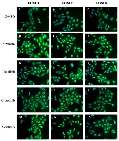Effect of PI3K and mTOR inhibitors on FOXO1 and FOXO4 localization. U2OS cells were cultured and treated for 1 h with (A–C) 0,5% DMSO as negative control, (D–F) 25 μM LY294002 as positive control or 1 μM (G–I) idelalisib, (J–L) crizotinib, (M–O) AZD8055. Fixed cells were incubated with green fluorescent specific antibodies against FOXO1, FOXO3 or FOXO4 isoforms, and imaged with fluorescence microscopy. Representative images taken at 20× magnification are shown.