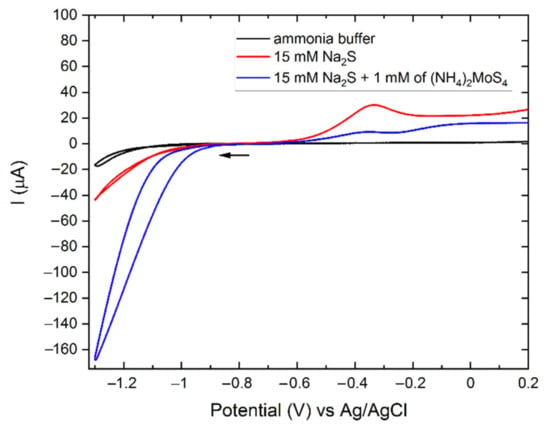 The electrochemical behavior of the solutions is shown in Figure 1. The cyclic voltammetries (CVs) of the ammonia buffer and the 15 mM Na2S solution present low cathodic currents, which are compatible with the reduction of hydrogen. On the other hand, the CV scan of the deposition solution containing TTM shows a strong cathodic signal starting from −1.0 V and reaching –170 µA at –1.3 V. This cathodic current was attributed to the reduction of TTM to MoS2 (Equation (1)) [60].