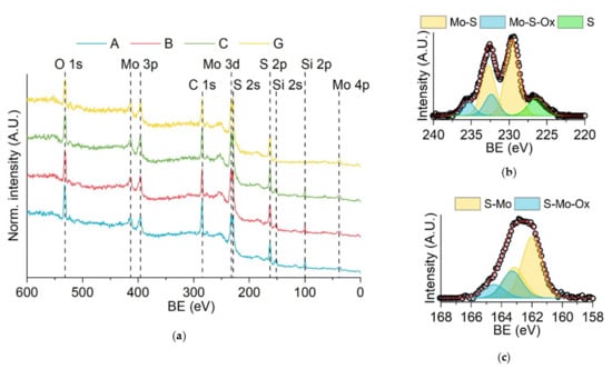 XPS spectra of the samples: (a) surveys of samples A, B, C and G; (b) high-resolution spectra of sample A in the Mo 3d region; (c) high-resolution spectra of sample A in the S 2p region.