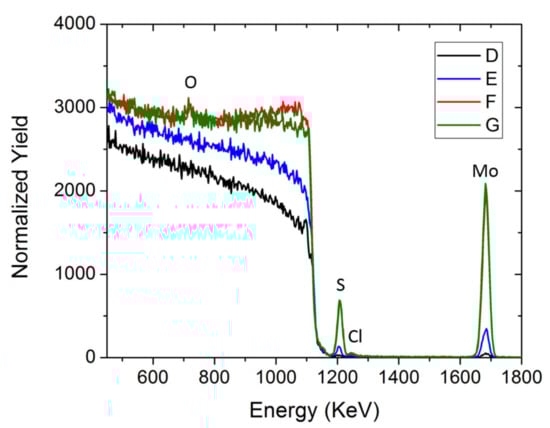 The sample compositions were obtained from the simulation fit of their RBS spectra, as reported in Figure 3. Measuring the integrated area, it is possible to estimate the elemental atomic surface density per element (at/cm2), hence the MoSx stoichiometry reported in Table 3 for each sample. The RBS spectra also report the presence of O, probably due to the partial oxidation of the sample that was previously confirmed by XPS analysis. Moreover, Figure 3 show minor chloride contamination, probably due to the leakage of the reference electrode. The increment in the elemental surface density increases linearly for the first cycles, whereas at higher cycling, it tends to saturate all the analyzed elements. Consequently, the stoichiometry slightly differs from sample to sample. In particular, the S/Mo ratio varies from 2.52 ± 0.15 in sample D to 1.89 ± 0.11 in sample G.