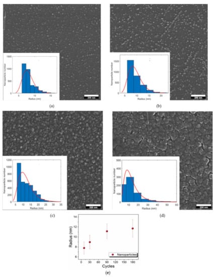 SEM images of: (a) sample D, 10 cycles; (b) sample E, 30 cycles; (c) sample F, 90 cycles; (d) sample G, 180 cycles; (e) correlation between the dimensions of the nanoparticles and the number of the deposition cycles. The insets of figures a-d show the statistical analysis of the dimension of the nanoparticles performed on the SEM images.