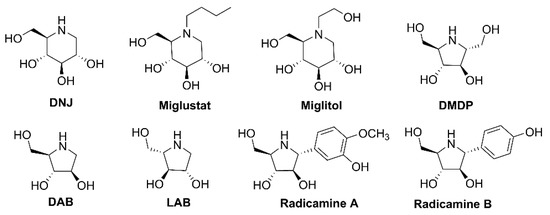 Iminosugars, containing an endocycling nitrogen atom that effectively mimics carbohydrates by facilitating the reversible and competitive inhibition of their processing enzymes, have generated much attention in recent years as targets in the treatment of a wide range of illnesses (e.g., diabetes, cancer, tuberculosis, and lysosomal storage disorders, etc.) [1,2,3,4,5,6]. Given the enormous range of biochemical events in which carbohydrate processing enzymes are implicated, iminosugars have enormous potential to be developed as inhibitors of glycosidases (glycoside hydrolases), glycosyltransferases (glycoside synthases), metalloproteinases, and nucleoside-processing enzymes [7,8,9,10,11]. It is worth noting that structural modifications to find potent inhibitors of the above enzymes among two of the most studied classes of iminosugars, polyhydroxylated pyrrolidines and piperidines, arouse great interest because of the wide range of their biological properties, such as glycosidase inhibition, shown over the past five decades [12,13,14,15,16].