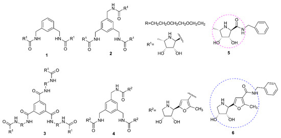 The first synthesis of tethered di- and trivalent pyrrolidine iminosugars to interfere with carbohydrate processing enzymes was reported by Robina and co-workers in 2013 [70]. At that time, the advantages of the multivalent effect for glycosidase inhibition over the corresponding monomer were gradually realized (e.g., for α- and β-glucosidases [74], for β-galactosidases [75]). Taking advantage of their experience in designing glycosidase inhibitors [76,77], the authors investigated the multivalent approach by comparing the α-l-fucosidase inhibitory activities of multi- and mono-pyrrolidine iminosugars. For this purpose, four di- and trivalent pyrrolidine derivatives (1–4) were synthesized based on fuco-configured 1,4-imino-cyclitols 5 and 6, which displayed good inhibitory activity towards α-l-fucosidase (Figure 3). The benzylamino pyrrolidine 5, designed as a monovalent reference for dimer 1 and trimers 2 and 3, was synthesized for the first time, while the furyl-substituted pyrrolidine 6, previously reported by the same research group [78], was selected for comparison with trimer 4.