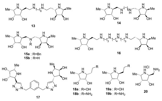 To further understand the complicated multivalent effect on α-fucosidase inhibition, Behr, Robina, and co-workers reported a library of divalent pyrrolidine iminosugars 13–17 using polyamine and triazole benzene as spacers to evaluate the contributions of the length and rigidity of the bridge, the number of nitrogen atoms present, and the moieties close to the pyrrolidine to the biological activity of divalent inhibitors [80]. Since there is no report of the monovalent references 18–20, their synthesis routes were also introduced. The inhibitory effect of chemically diverse spacers in dimers on α-fucosidase was systematically investigated, and a potent and specific α-fucosidase inhibitor (compound 17, Ki = 3.7 nM) was thus discovered (Figure 4).