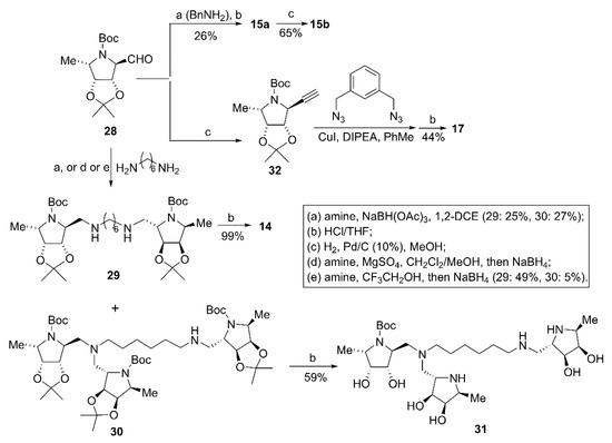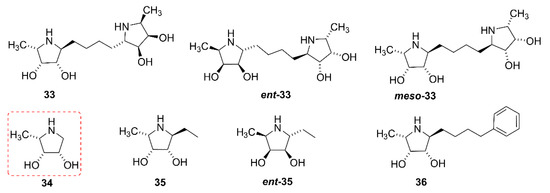 The synthesis of the divalent iminosugars 14 and 15 was started from the known compound 28 [83], which was reacted with benzylamine and sodium triacetoxyborohydride, followed by acidification and deprotection to afford compound 15a in 26% yield. Dimer 15b was obtained by debenzylation of 15a under the H2/Pd/C system in 65% yield. Reacting 28 (2-fold excess) with hexamethylenediamine by similar methods (MgSO4 then NaBH4 or amine then NaBH(OAc)3) both gave dimer 29 in a low yield (25%) with an undesired trivalent product 31 (27%). Gratifyingly, the yield of 29 could be increased to 49% by reacting 28 with ethylenediamine in the presence of sodium borohydride and 2,2,2-trifluoroethanol. For exploration, the amino-protected dimer 29 and trimer 30 were both deprotected under hydrochloric acid to generate the target products 14 and 31, which were likewise tested towards α-fucosidase. Dimer 17 was synthesized due to the good inhibitory activities of (pyrrolidin-2-yl)triazoles shown by the researchers previously [83]. Thus, after the reduction of 28 to 32, target dimer 17 was generated through a two-step reaction by treating excess 32 with 1,3-bis(azidomethyl)benzene under the catalysts of CuI and DIPEA, followed by acidification. Column chromatography was carried out to remove unreacted 32 and yield 17 in 44% yield (Scheme 3). Increasing results began to highlight the advantages of multivalent effects. However, some contradictory experimental results were still reported. Elucidating the specific binding mechanisms of multi-ligands with enzymes is urgent and challenging. Behr and co-workers reported three stereoisomeric pyrrolidine dimers in 2016 to explore the divalent effect on fucosidase inhibition [84]. The divalent iminosugars (33, ent-33, and meso-33) were constructed based on a known fucosidase inhibitor 34 reported by Steensma [85]. The monovalent iminosugars 35, ent-35, and 36 were also synthesized as referenced (Figure 5).