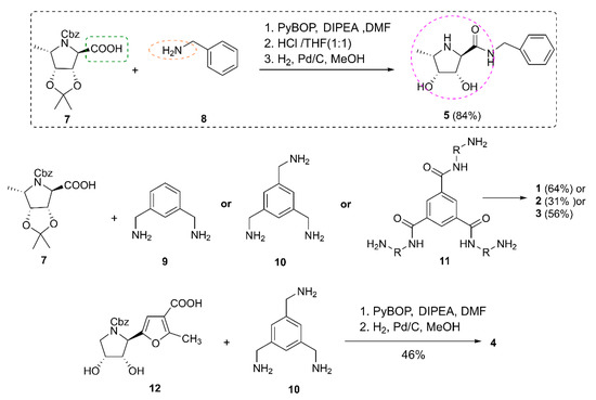 The authors employed a classical amide coupling reaction to synthesize the desired iminosugars, starting from commercially available benzylamine and the O- and N-protected carboxylic acid 7 [70], using PyBOP as the coupling agent and DIPEA as base gave protected intermediates. Then, the excess benzylamine was easily separated by column chromatography. A similar method was used to remove excess amines for the preparations of 1–4. Finally, isopropylidene deprotection with HCl and subsequent catalytic hydrogenation with H2/Pd/C gave the corresponding target product 5 in 84% yield. Di- and trivalent iminosugars were obtained with commercially available m-xylylenediamine 9 and triamine 10 as the scaffolds for bi- and trivalent glycomimetics, respectively. Moreover, the long-tethered triamine 11 reported by the same research group [79] was chosen as C-3 symmetric template to yield the long spacer trivalent iminosugar 3. Amide coupling reactions between scaffolds and compound 7 under the same condition above gave the corresponding target products 1–3 in moderate-to-good yields. Similarly, trimer 4 was obtained by the coupling reaction between a previously synthesized pyrrolidine-furan carboxylic acid 12 [78] and template 10, followed by standard reductive hydrogenation in 46% yield (Scheme 1).