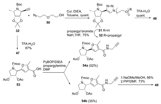 Alkynyl pyrrolidines 47–49 were selected as the skeletons because their analogs (pyrrolidin-2-yl)triazole and (pyrrolidin-2-yl)furans were previously shown to exhibit significant glycosidase inhibition to α-fucosidases and β-galactosidases by the same group [83,92]. The initial step was to prepare the different tethered alkynyl pyrrolidine derivatives 47–49. Known compounds 32 [84] and 53 [93], previously prepared by the same group from D-lyxose and D-glucose, were employed as starting materials. Alkynyl pyrrolidine 47 was readily prepared from 32 via Boc-deprotection in TFA in 87% yield. As expected, the CuAAC coupling reaction was carried out between alkynyl pyrrolidine 32 and azide 50 [94] to yield quantitative triazole 51. Then, propargylation of triazole 51 with NaH followed by acidic deprotection of derivative 52 quantitatively provided the desired alkynyl derivative 48. Classic amide coupling conditions (PyBOP/propargylamine) were employed to form the epimers 54a and 54b from compound 53, further separated by chromatography. Based on the previous report, cis-configured epimer 54b was chosen for deprotection to yield the target pyrrolidine-furan hybrid 49, since trans-configured epimer 54a exhibited weak α-fucosidase inhibition. Finally, the diazides a–l, another part for CuAAC coupling, were prepared according to the design of the spacer. (Pyrrolidin-2-yl)triazole libraries were generated by parallel CuAAC couplings between alkynyl functionalized pyrrolidines 47–49 and diazides a–l under the catalysts of CuI or CuSO4. Due to the high efficiency of CuAAC coupling, granting almost quantitative yields with no side reactions, the desired products were all processed and directly screened for enzyme inhibition testing (Scheme 6).