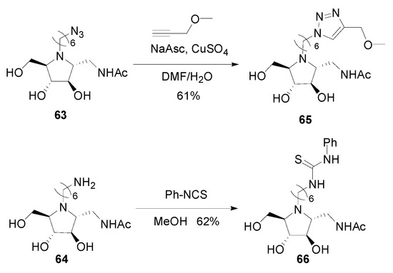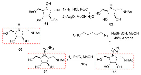 The authors selected pyrrolidine derivative 60 as the skeleton of the divalent iminosugar libraries. Compound 60 was proved to be an outstanding inhibitor of β-N-acetylhexosaminidase in 2001 by Wong’s group [95], which is consistent with the purpose of this research. Amino and azido functional groups were introduced based on 60 through molecular modification to carry out the subsequent click reaction. Azide 63 was obtained via reduction of cyanide in the known compound 61 [96], followed by acylation and reductive amination with 6-azidohexanal using NaBH3CN as catalyst in 49% yield (Scheme 8) [97]. Catalytic hydrogenation of 63 by H2/Pd/C gave the amine 64 in 76% yield (Scheme 8).
