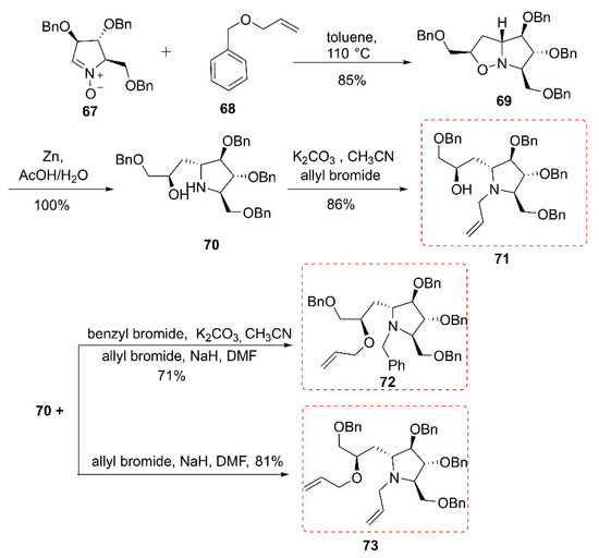 Cardona and co-workers reported an alternative way to synthesize multivalent pyrrolidine iminosugars without metals in 2019 [62]. The synthesis relies on iminosugar pyrrolidine DAB and three selective and high-yielding steps (1,3-dipole cycloaddition with nitrone 67, N–O bond cleavage of the adduct, and selective N- and/or O-allylation), and allows the preparation of different topologies in the DAB clusters. Nitrone 67, obtained from the commercially available tribenzylated d-arabinose [99], and allyl benzyl ether 68 [100] were employed to prepare exo-anti isoxazolidine 69 in 85% yield through 1,3-dipole cycloaddition (1,3 DC). The 1,3 DC process is a crucial step since a high degree of stereoselectivity in the reaction must be guaranteed to reduce isomer formation. Previous research showed that high exo-anti selectivity is ascribed to the tans-trans configurated nitrone 67, whose C-3 and C-5 substituents on the same face are opposite to C-4. Thus, the exo mode was preferred to avoid repulsive steric interactions with a substituent at C-4 [99,101,102]. Then, the cleavage of the N–O bond of 69 in the presence of 10 equiv. of Zn afforded 70 quantitatively. Note that compound 70 is a key intermediate since the selective N-and/or O-allylation would generate new dipolarophiles 71–73, which would introduce a second or third DAB moiety by 1,3 DC with nitrone 67. MW-assisted selective N-allylation of 70 was carried out using electrophile allyl bromide to afford intermediate 71 in 86% yield. Protecting the amine of 70 using benzyl bromide, followed by selective O-allylation in the presence of allyl bromide and K2CO3, gave intermediate 72 in 71% yield. The N,O-bis allylated pyrrolidine 73 was obtained by treating 70 with a high excess of allyl bromide (6 equiv.) and NaH (8 equiv.) in 81% yield (Scheme 12).