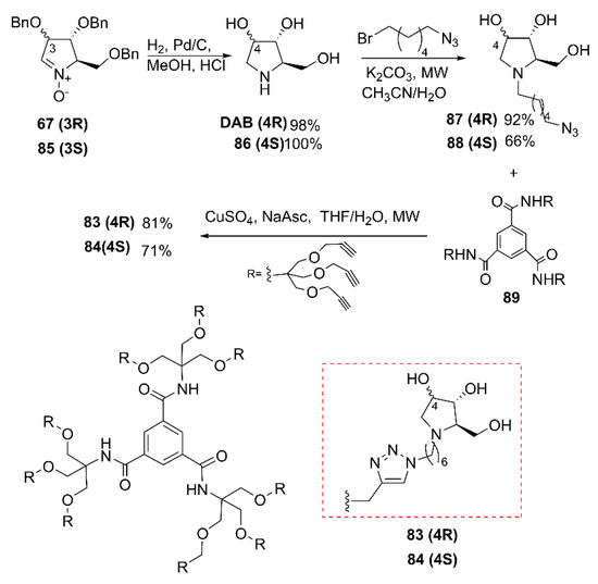 In 2016, Cardona and co-workers explored the inhibition of sulfatases using the first two examples of pyrrolidine clusters [67]. Nonavalent pyrrolidine iminosugars 83 and 84 were obtained from DAB and 1,4-dideoxy-1,4-imino-d-ribitol (86), prepared by the deprotection of the starting nitrones 67 [103] and 85 [104]. Upon selective N-alkylation with 1-azido-6-bromohexane [105] in the presence of K2CO3 under MW irradiation, DAB gave the deprotected azide 87 in 92% yield. Reacting 87 with the nonadiyne scaffold 89 [106] using the standard CuAAC cycloaddition condition (CuSO4 (30 mol%), sodium ascorbate (60 mol%), THF/H2O) afforded a mixture of unreacted 87 and desired product 83, which was further purified by column chromatography and size exclusion chromatography Sephadex LH-20, obtaining pure 83 in 81% yield. Similar synthetic routes were applied for the synthesis of target iminosugar 84. Starting from a different configuration of bioactive 1,4-dideoxy-1,4-imino-d-ribitol (86), selective N-alkylation afforded 88, and CuAAC coupling gave ribose configured 84 in 71% yield (Scheme 15).