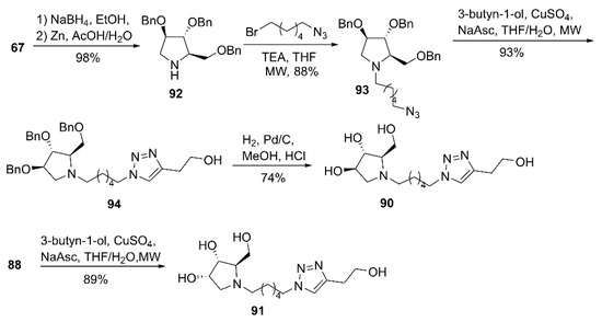 The monovalent references 90 and 91 corresponding to compounds 83 and 84 were synthesized to explore the multivalent effect further (Scheme 16). The reference 90 was synthesized from known d-arabinose derived nitrone 67. Two-step reduction by NaBH4 followed by Zn in AcOH gave amine 92 in 98% yield, which was treated with 1-azido-6-bromohexane in basic conditions under microwave irradiation to afford azide 93 in 88% yield. The CuAAC coupling between azide 93 and 3-butyn-1-ol was carried out under MW irradiation to give 94 (93%), which was further deprotected using H2 and Pd/C in acidic MeOH to give the final product 90 in 74% yield. Compound 91, generated through one-step synthesis, was obtained by cycloaddition of azide 88 to 3-butyn-1-ol in the presence of CuSO4 and sodium ascorbate under MW irradiation in 89% yield (Scheme 16).