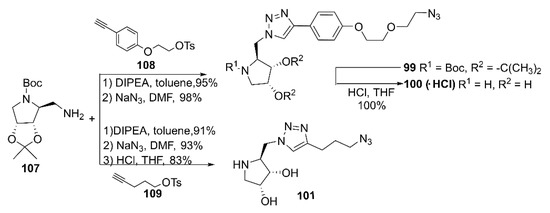 Starting from the azidomethyl pyrrolidine 107 reported by the same group, the protected azide 99 was obtained in good yield by reacting with the aromatic alkyne 108 [109] through CuAAC and then treating with NaN3 in 93% yield. Then, classic conditions (HCl/THF) were used to get rid of the protecting group to give the unprotected derivative 100 quantitatively. The same reactions performed in 107 and alkyne 109 [95] via a sequence of CuAAC coupling, nucleophilic displacement with NaN3, and acidic deprotection afforded 101 in high yield. The synthesis of azides 100 and 101 was not only to obtain the final multivalent clusters but also as monomers for bioactivity control. However, due to the poor solubility of azide 100, protected azide 99 was selected in the subsequent synthesis and then deprotected again with hydrochloric acid (Scheme 18).
