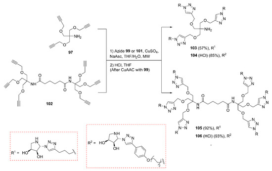Finally, microwave-assisted CuAAC cycloaddition of azide 99 or 101 with scaffolds 97 [110] and 102 [108] in the presence of CuSO4, sodium ascorbate in THF/H2O (2:1), followed by checking reactions through 1H NMR spectra of the crude mixtures, gave the pyrrolidine-based iminosugar clusters 103–106 in good yields (57–93%, Scheme 19). It is worth noting that the resulting crudes, mixed with excess azide 99 or 101 and desired products, were purified by stirring with Quadrasil® MP followed by chromatography column (silica gel or Sephadex LH-20).