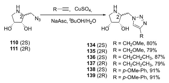 General reaction conditions of the click reaction involved using CuSO4 and sodium ascorbate as catalysts and in THF–H2O under microwave irradiation at 80 °C. Similar to the methods for compounds 103–106, chromatography column (silica gel or Sephadex LH-20) was employed to separate the unreacted azidoalkyl pyrrolidines. Multimeric derivatives (114–133) were generated in high yields (55–99%). The monovalent references (134–139) were prepared via CuAAC reaction between monomers (110 and 111) and the corresponding alkynes in high yields (79–91%), which were submitted to evaluate inhibition against human GCase and α-Gal A along with the corresponding multivalent iminosugars 114–133 (Figure 9, Scheme 20).