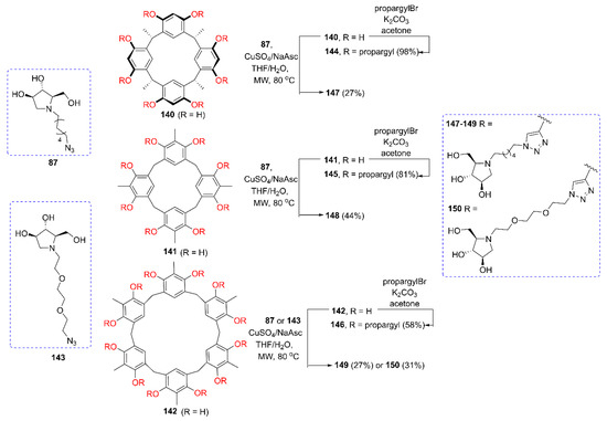 Resorcinarene 140–142 [113,116] are macrocycles consisting of four to six rings of resorcinol obtained by resorcinol/aldehyde acid-catalyzed condensation reaction (Scheme 21). Interestingly, each aromatic moiety of the macrocycle contains two hydroxyl functional groups, making it suitable for constructing multivalent iminosugars. Azides 87 and 143, belonging to the DAB-derived pyrrolidine family, were selected as skeletons (Scheme 21). Azide 87 [67] was reported by the same group previously, and new azido-ending ligand 143, which possessed a more hydrophilic linker, was newly synthesized to explore the role of the nature of linkers in bioactivity [68].