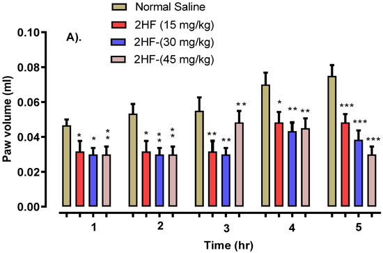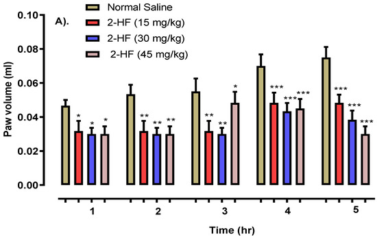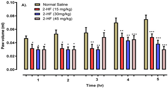 Our tested compound (2-HF) produced an anti-inflammatory, dose-dependent effect using carrageenan and serotonin as well as histamine-induced paw edema models. Animals treated with 15 mg kg−1 of 2-HF decreased the temporal inflammatory effect induced by carrageenan i.e., p < 0.05, after 1 h, p < 0.01 after 3 h and p < 0.001 after 5 h as shown in Figure 6.