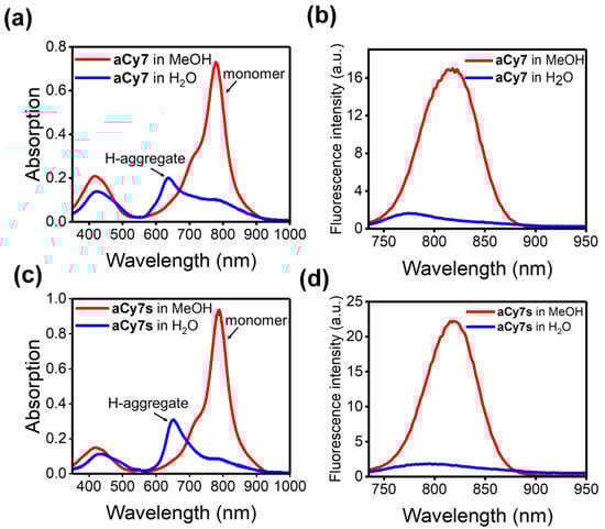 Absorption (a,c) and emission (b,d) spectra of aCy7 (5 µM) and aCy7s (5 µM), respectively, in methanol (red) and water (blue) at room temperature. λex = 720 nm; slit width = 5 nm.