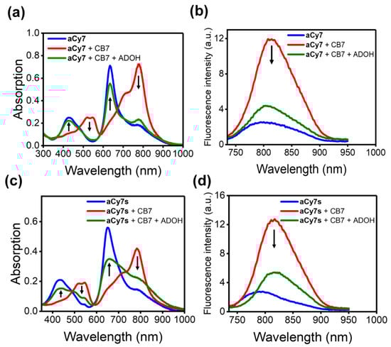 (a,b) Absorption (left) and emission (right) spectra of the complex CB7@aCy7 before (red, 10 molar equivalents of CB7) and after addition of 1-adamantanol (ADOH, green, 10 molar equivalents) in distilled water, pH 5.70, at room temperature. (c,d) Absorption (left) and emission (right) spectra of complex CB7@aCy7s before (red, 30 molar equivalents of CB7) and after addition of ADOH (green, 10 molar equivalents) in water, pH 5.70, at room temperature. λex = 720 nm; slit width = 5 nm.