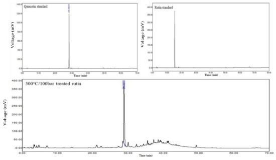 The rutin and quercetin contents of the SCW-treated rutin are shown in Table 1, and the chromatogram of rutin and quercetin standard and 300 °C/100 bar treated rutin sample is shown in Figure 1. Rutin was not present in all samples, whereas the quercetin content was 1.40 mg/g at 400 °C/250 bar and 381.38 mg/g at 200 °C/15 bar. According to Vetrova et al. [15], when rutin was treated with subcritical water, the quercetin content increased with increasing the temperature up to 200 °C but decreased at temperatures above 200 °C. The roasting procedure of noni leaves produced flavonol aglycones from glycosides, which could lead to enhanced bioactivity [16,17]. In aqueous solutions, all flavonoids are decomposed when heated at temperatures above 100 °C. This finding is similar to our results and is due to the breakdown or change in their structure in such a way that the HPLC/DAD signal of the primary structure can no longer be detected [18].