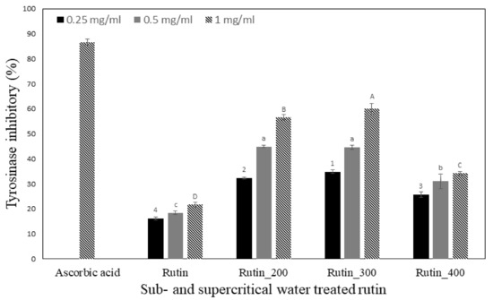 Under normal conditions, melanin increases the skin’s resistance to irritation caused by ultraviolet rays, but excessive biosynthesis causes pigmentation and skin damage, such as spots, freckles, and age spots. The inhibition of tyrosinase activity causes skin whitening, and research on physiologically active substances that effectively inhibit tyrosinase is therefore very important in the cosmetic industry [23]. We examined the possibility of using SCW-treated rutin as a whitening cosmetic material, and its tyrosinase inhibitory activity is shown in Figure 2. Ascorbic acid was used as the positive control and measured an inhibitory rate of 86.59% at a concentration of 1 mg/mL, whereas the values obtained from 1 mg/mL sub- and SCW-treated rutin were 21.72–60.05%. Among them, SCW-treated rutin at 300 °C/100 bar measured the highest inhibitory activity (60.05% at 1 mg/mL). Our results are in agreement with Koyu et al. [24], who reported the tyrosinase inhibitory activity of subcritical water extracts of Morus nigra fruits and found that the tyrosinase inhibitory activity increased as the subcritical water extraction temperatures increased.