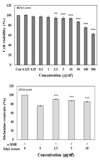 Figure 4. Cell viability and inhibition melanin synthesis of ethyl acetate fraction on B16F10 cells. B16F10 cells (1 × 104 cells/well) were treated with various concentrations (1, 2.5, 5, 10, 50, 100, and 500 µg/mL) of extracts prior to the determination of cellular viability through MTT assay and were treated with ethyl acetate and α-MSH. ** p < 0.01, *** p < 0.001; significant difference compared to control.
